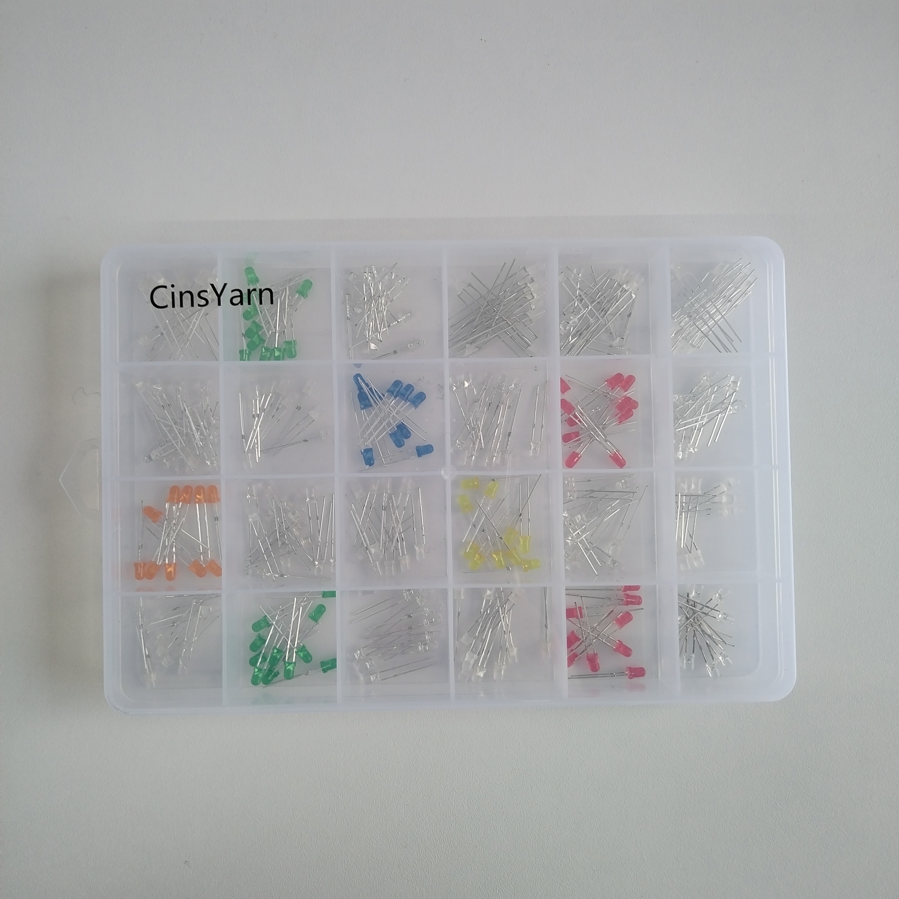 Overview: 3 mm light emitting diodes (LEDs) kit DC (20mA), Round lens (clear transparent) 2 leads, 24 grids x 10pcs = 240pcs mixed, multi luminous intensity.